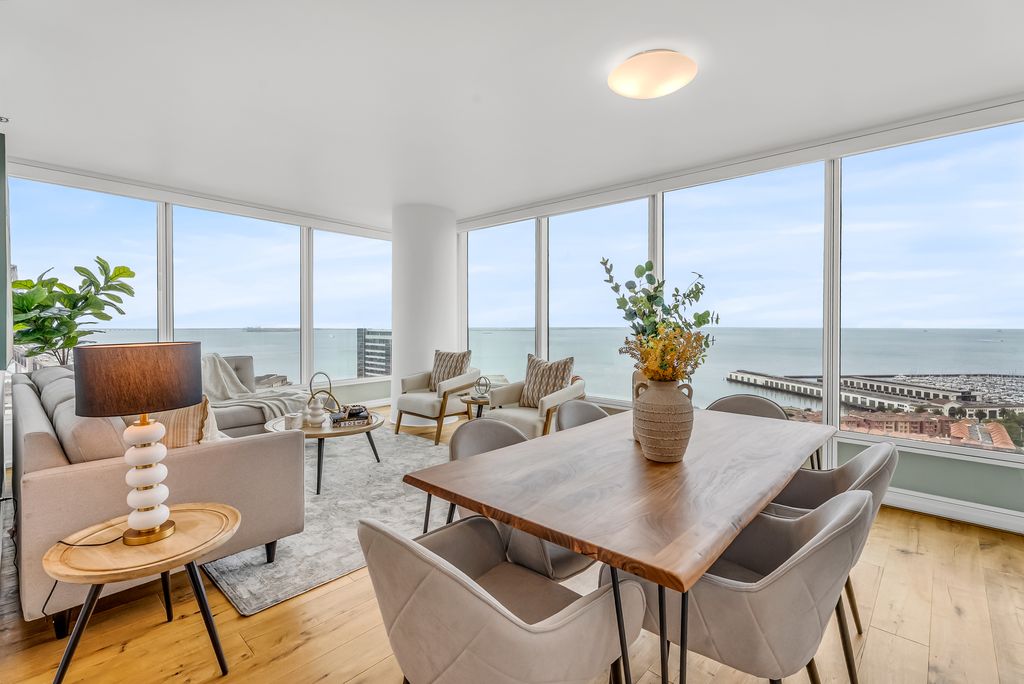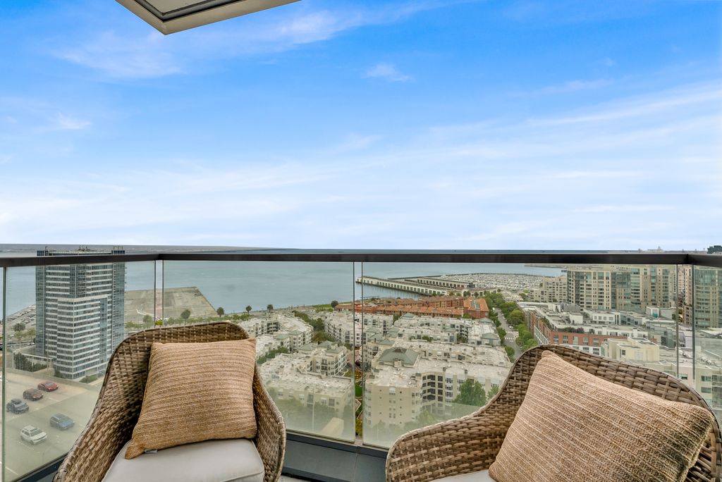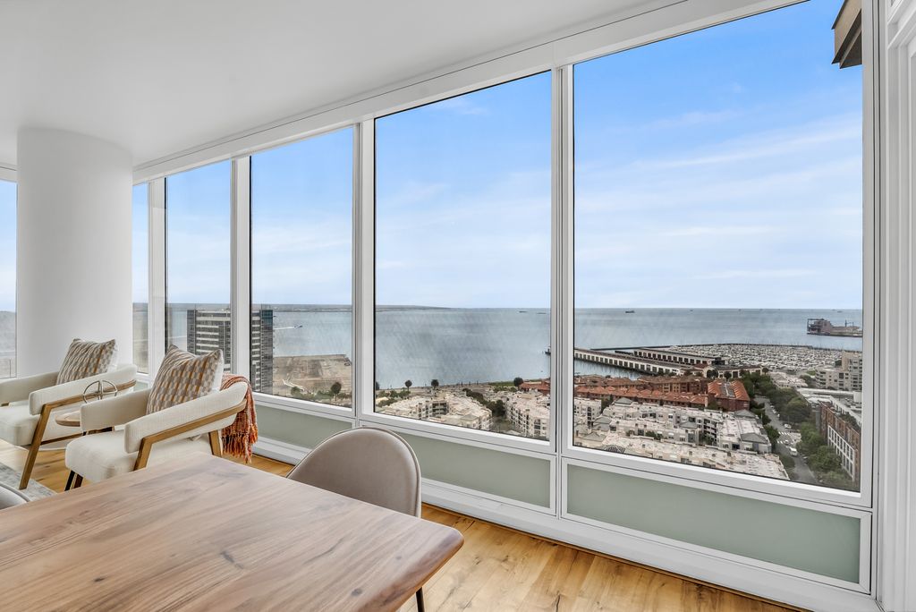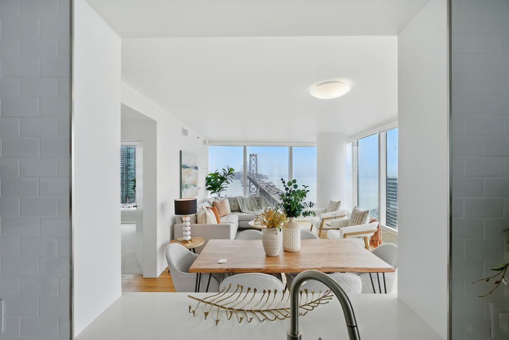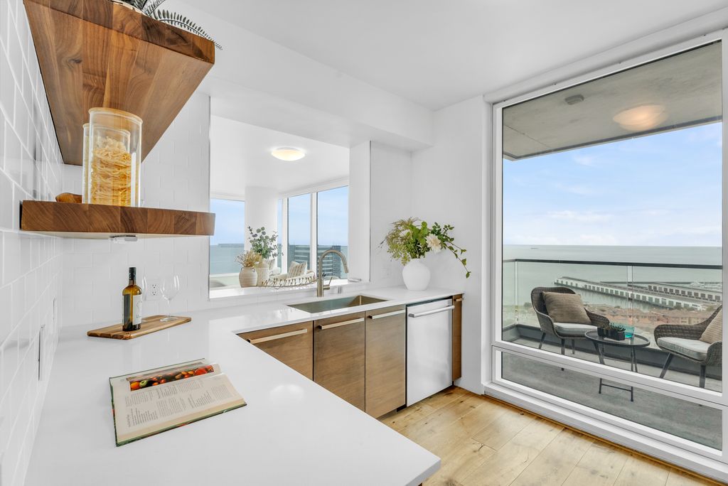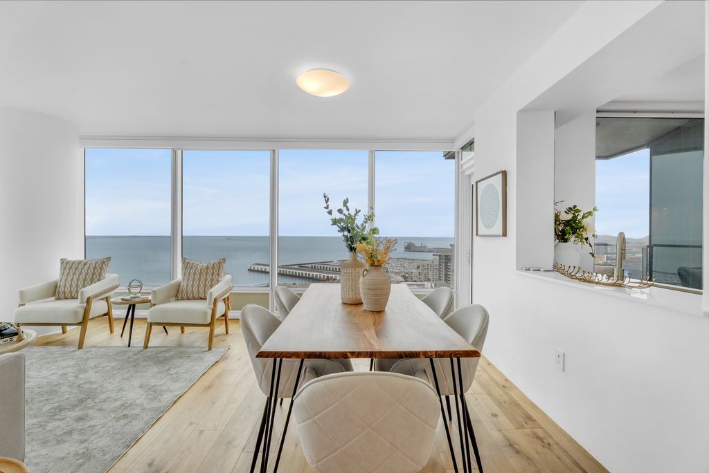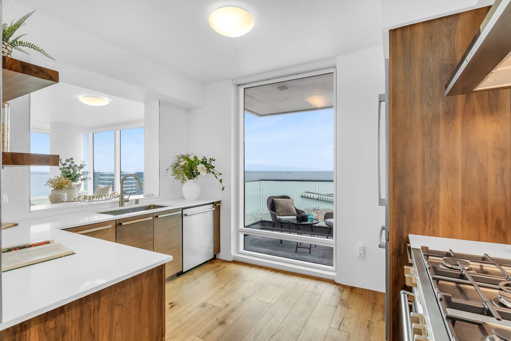 The kitchen is a chef’s dream, showcasing custom Italian cabinets that add a touch of European sophistication. It also includes quartz countertops, a stylish backsplash, a Bertazzoni range and oven, Bertazzoni hood, new kitchen sink, and a Bosch refrigerator and dishwasher—all beautifully realized in 2021. Modern lighting fixtures accentuate the space, and the trimless baseboards offer a sleek, contemporary aesthetic. This highly sought-after floor plan provides perfect flow, privacy, and spaciousness, along with direct views of the Bay Bridge and water.