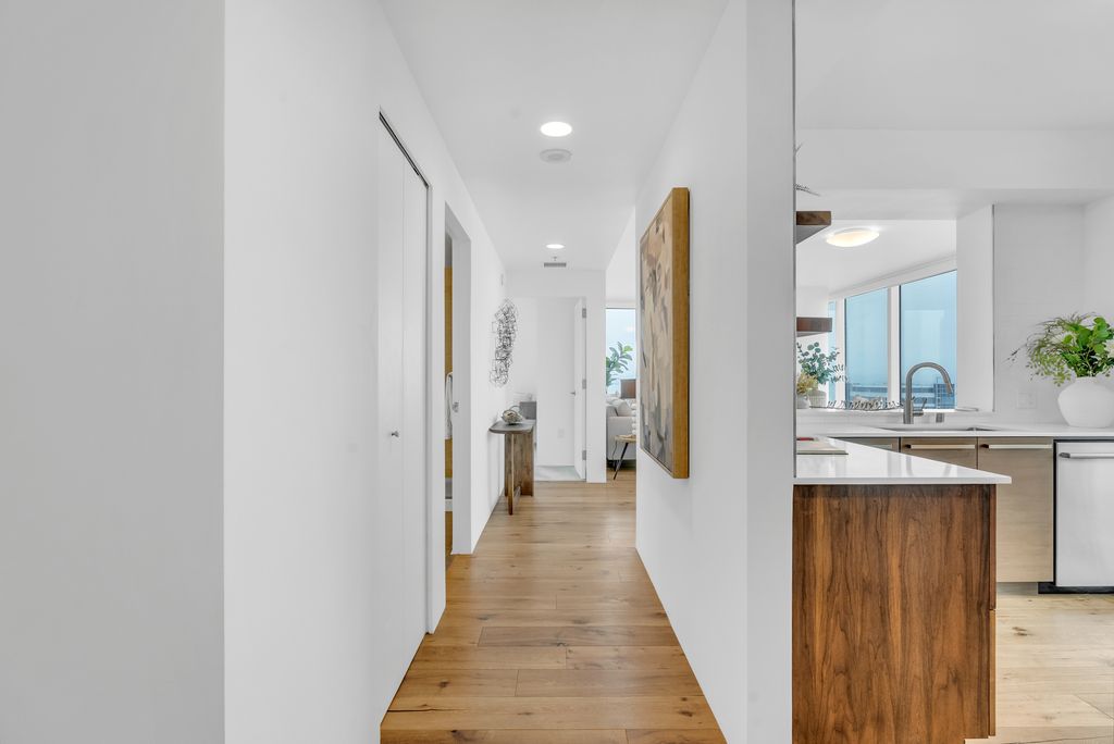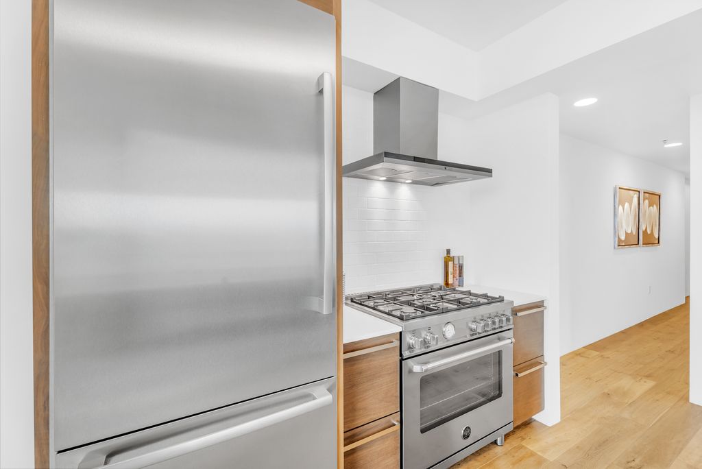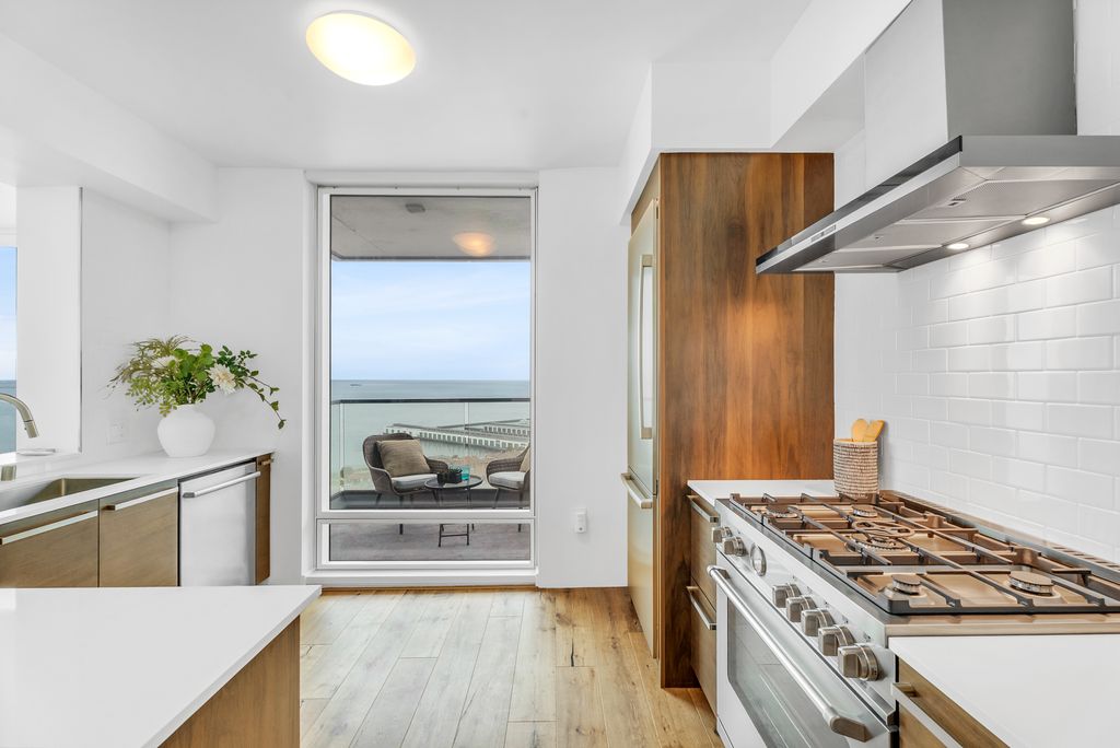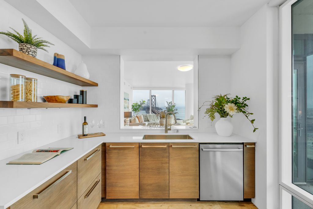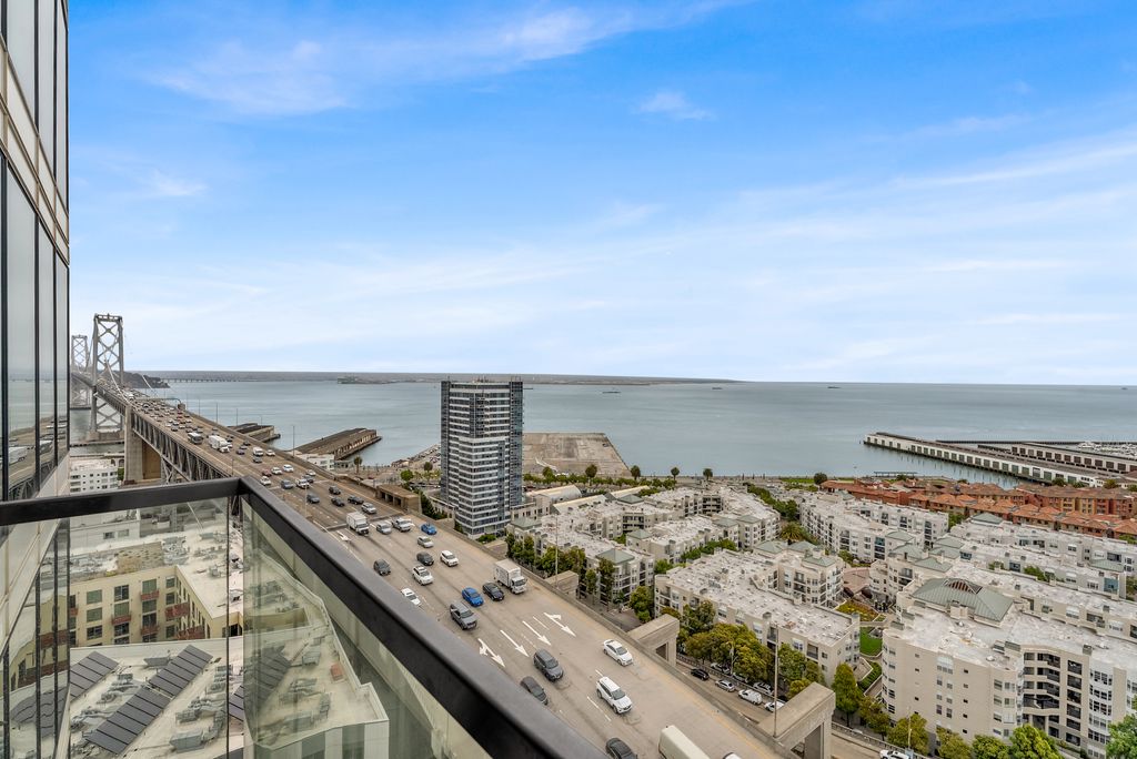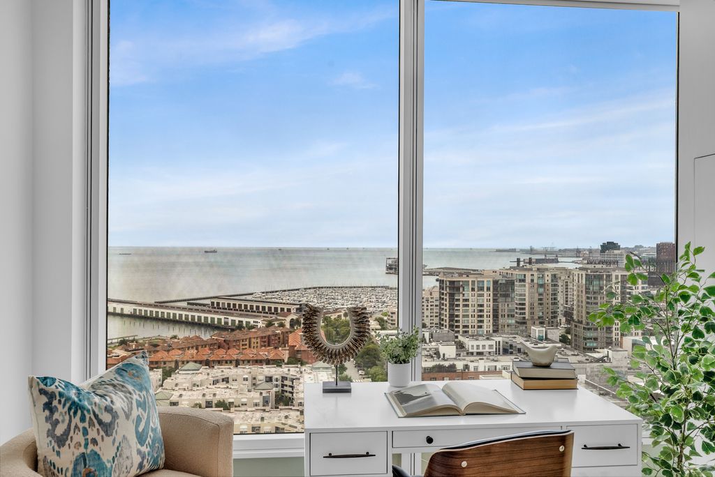 The kitchen is a chef’s dream, showcasing custom Italian cabinets that add a touch of European sophistication. It also includes quartz countertops, a stylish backsplash, a Bertazzoni range and oven, Bertazzoni hood, new kitchen sink, and a Bosch refrigerator and dishwasher—all beautifully realized in 2021. Modern lighting fixtures accentuate the space, and the trimless baseboards offer a sleek, contemporary aesthetic. This highly sought-after floor plan provides perfect flow, privacy, and spaciousness, along with direct views of the Bay Bridge and water.