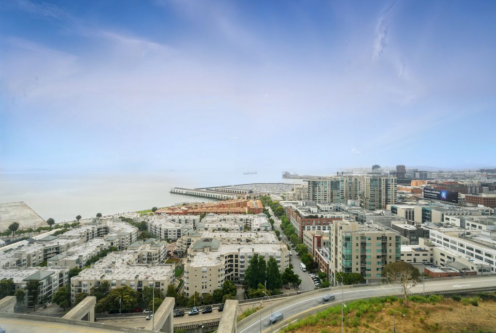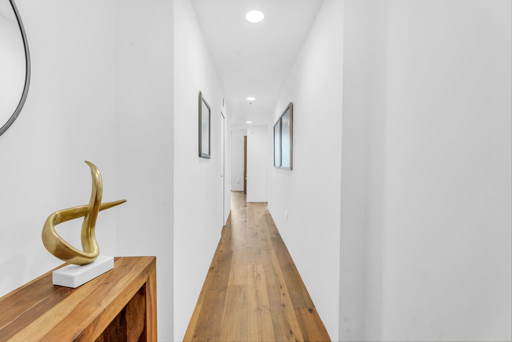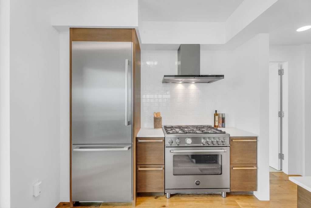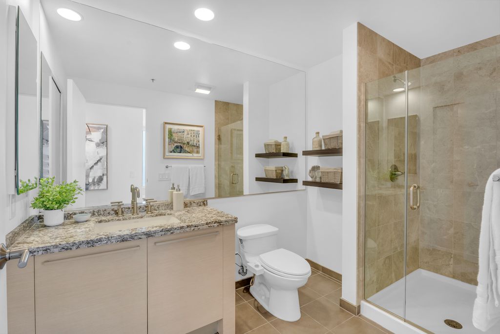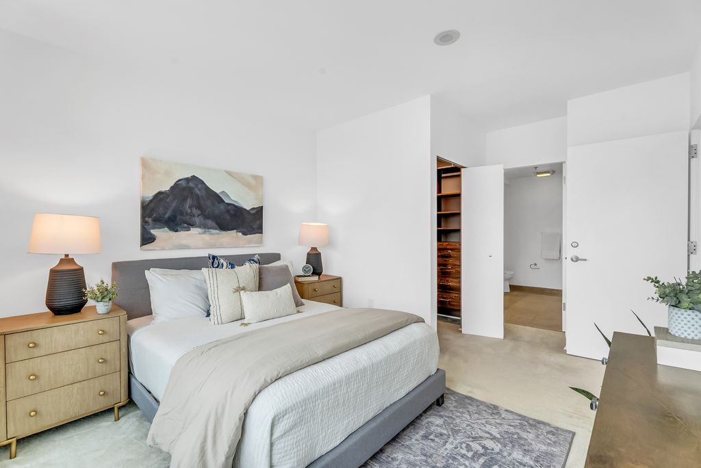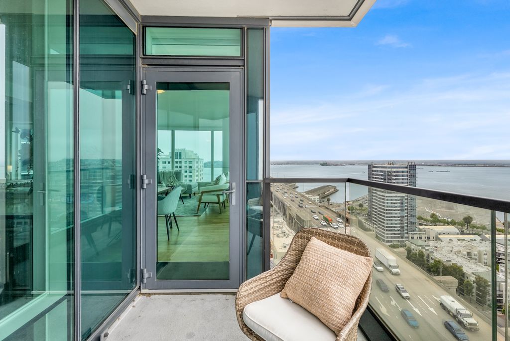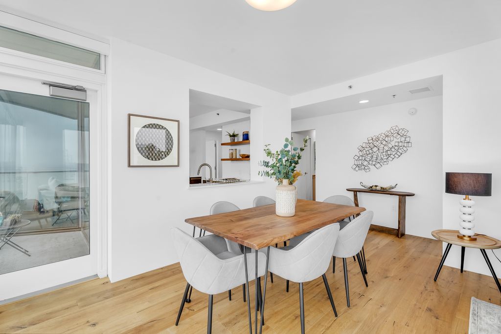 The kitchen is a chef’s dream, showcasing custom Italian cabinets that add a touch of European sophistication. It also includes quartz countertops, a stylish backsplash, a Bertazzoni range and oven, Bertazzoni hood, new kitchen sink, and a Bosch refrigerator and dishwasher—all beautifully realized in 2021. Modern lighting fixtures accentuate the space, and the trimless baseboards offer a sleek, contemporary aesthetic. This highly sought-after floor plan provides perfect flow, privacy, and spaciousness, along with direct views of the Bay Bridge and water.