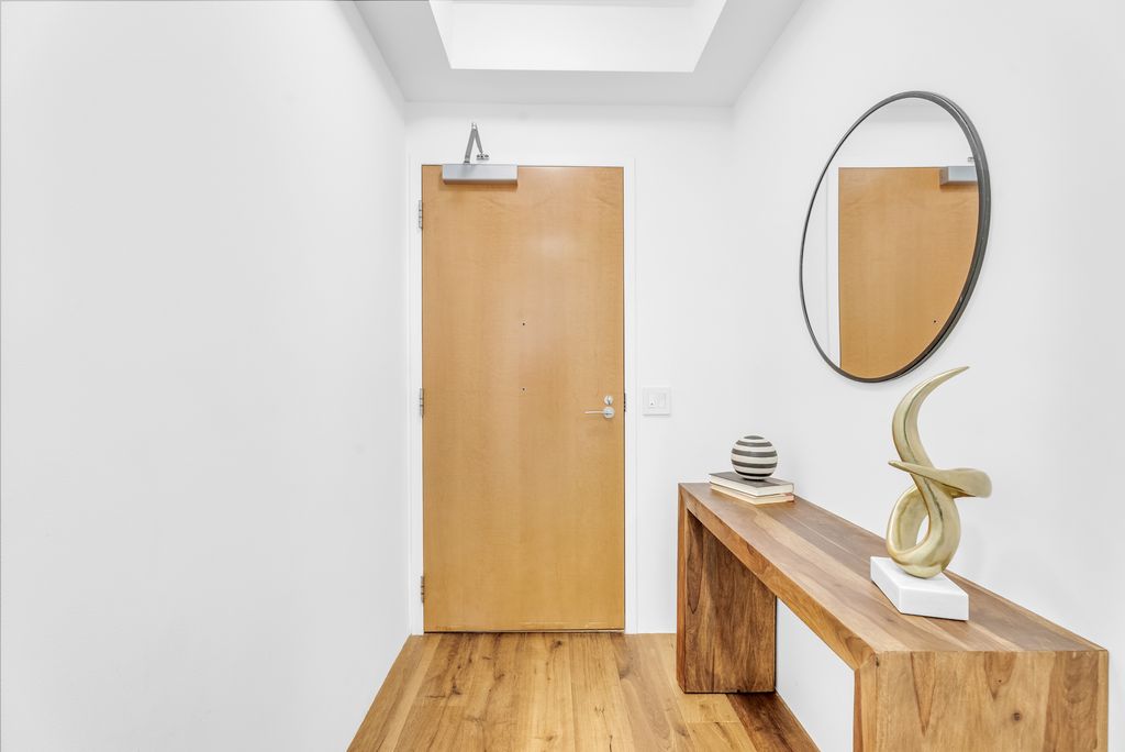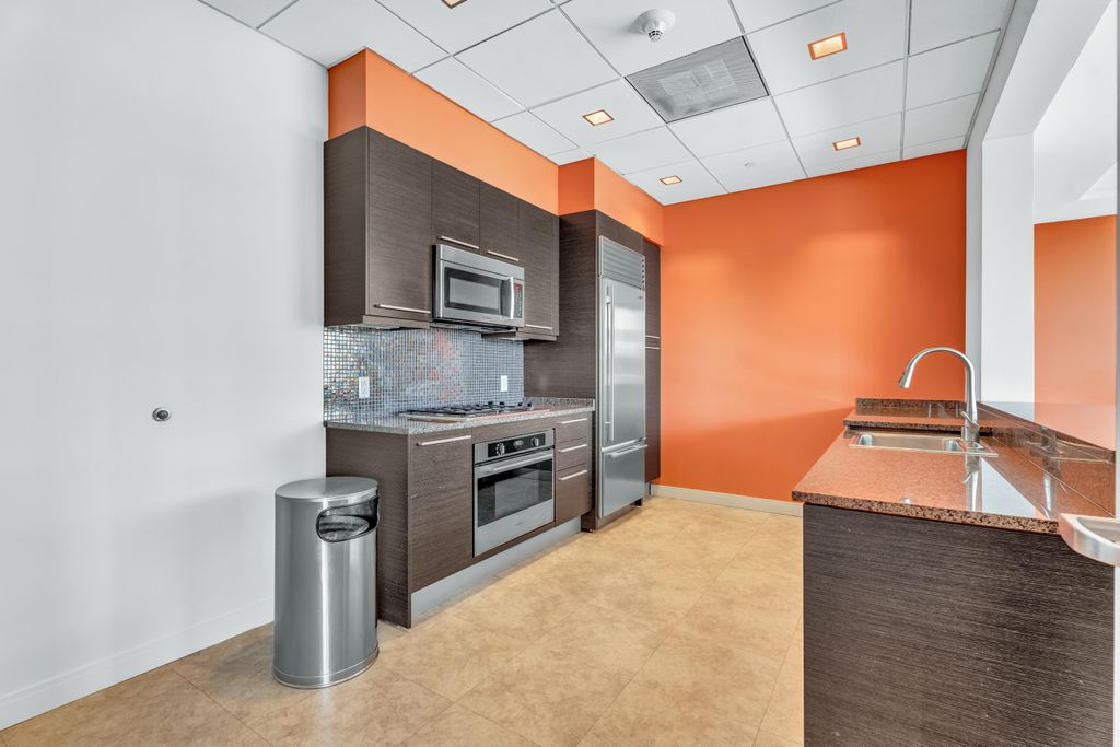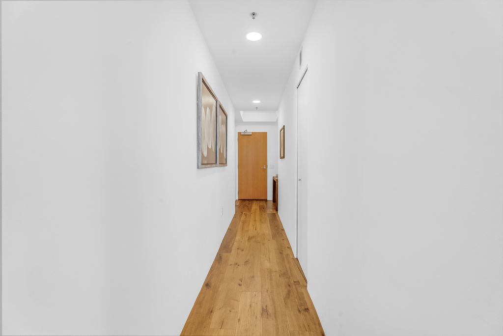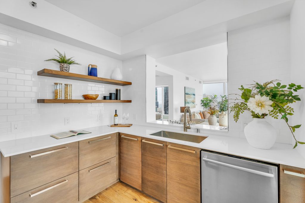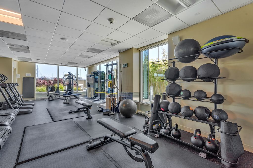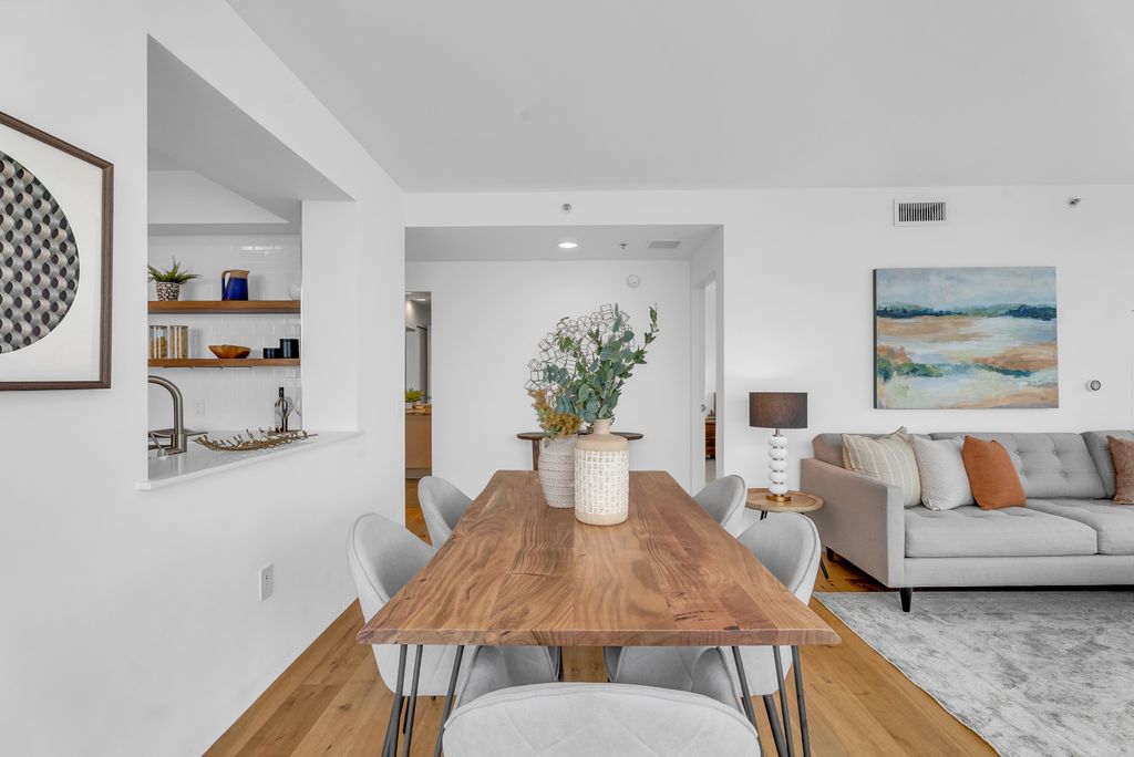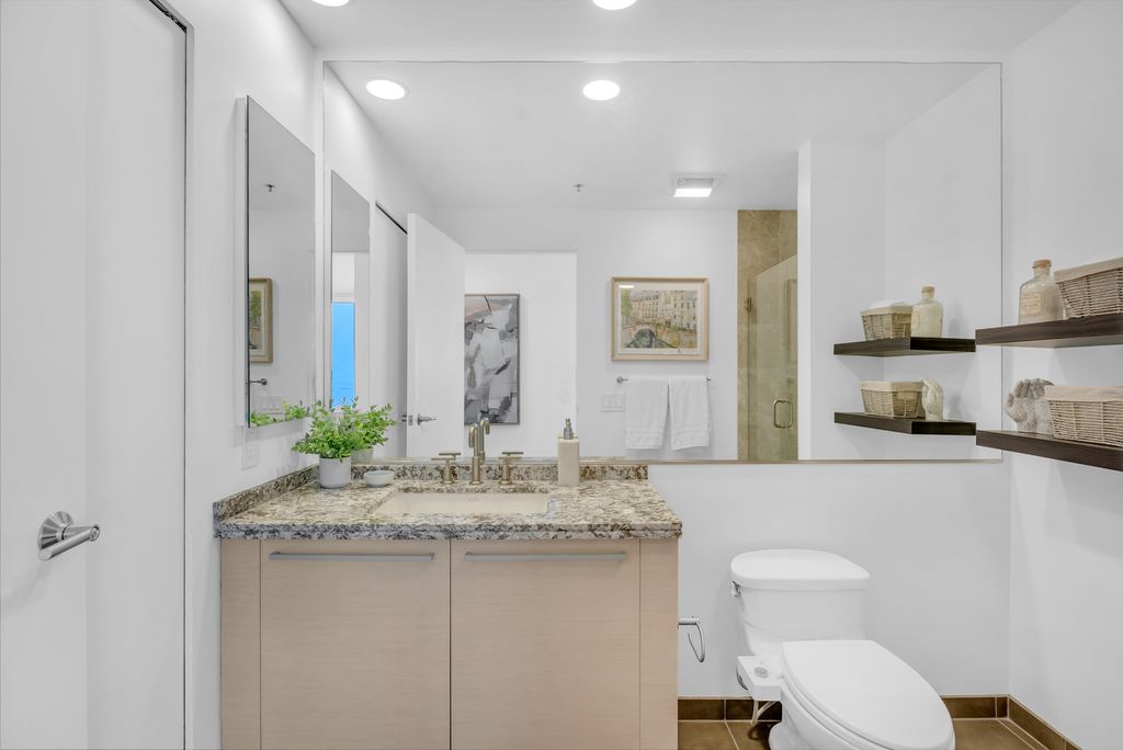 The kitchen is a chef’s dream, showcasing custom Italian cabinets that add a touch of European sophistication. It also includes quartz countertops, a stylish backsplash, a Bertazzoni range and oven, Bertazzoni hood, new kitchen sink, and a Bosch refrigerator and dishwasher—all beautifully realized in 2021. Modern lighting fixtures accentuate the space, and the trimless baseboards offer a sleek, contemporary aesthetic. This highly sought-after floor plan provides perfect flow, privacy, and spaciousness, along with direct views of the Bay Bridge and water.
