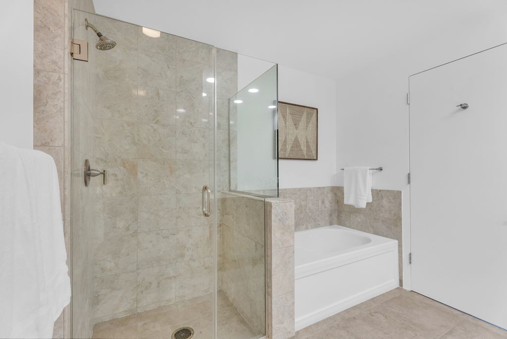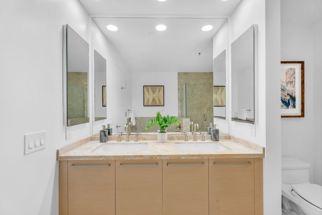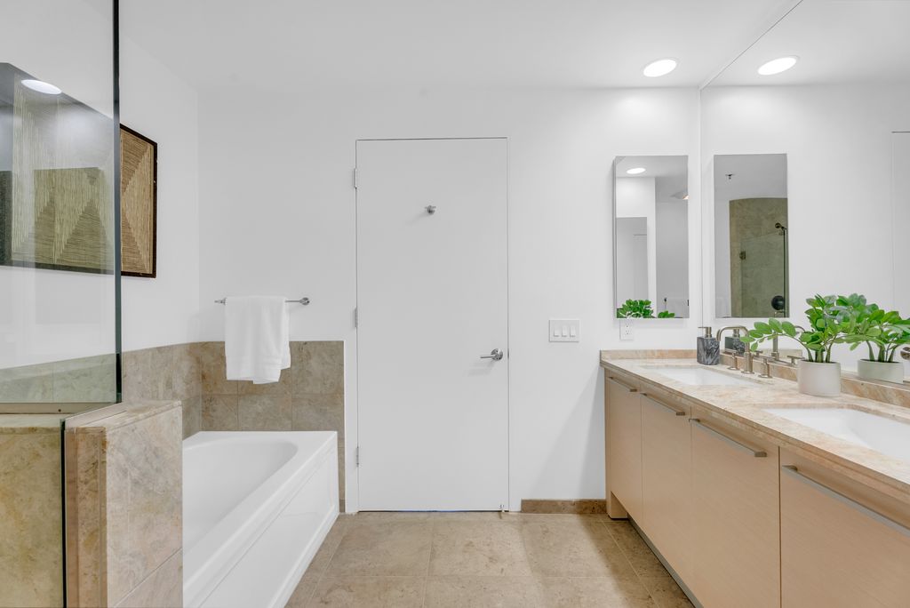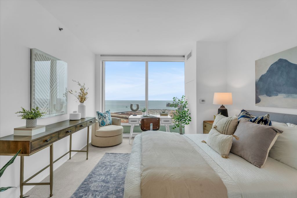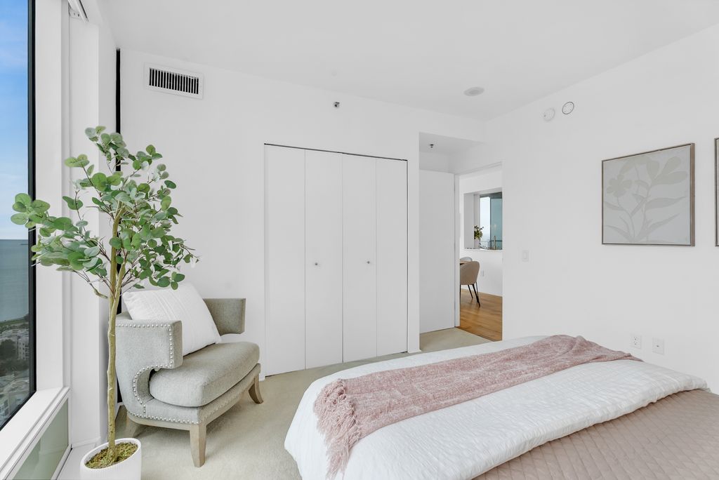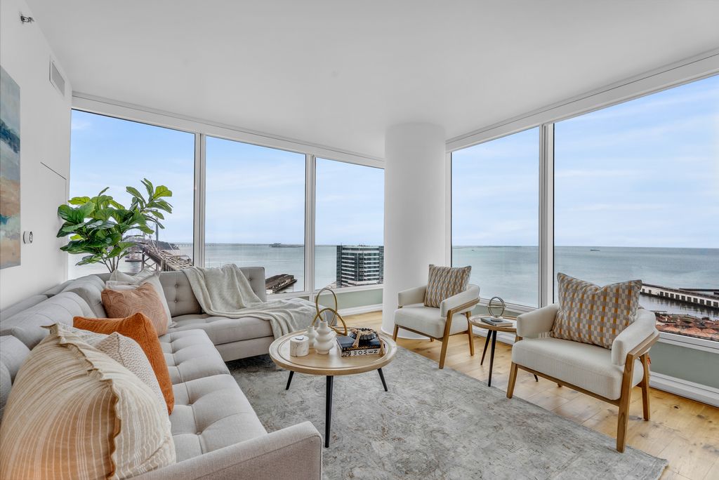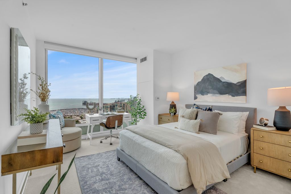 In the expansive living area, floor-to-ceiling windows flood the space with natural light and frame stunning bridge and water views, enhanced by custom window treatments. The primary suite is a luxurious escape with a walk-in closet and spa-inspired ensuite bathroom featuring a double sink, separate shower, and soaking tub.