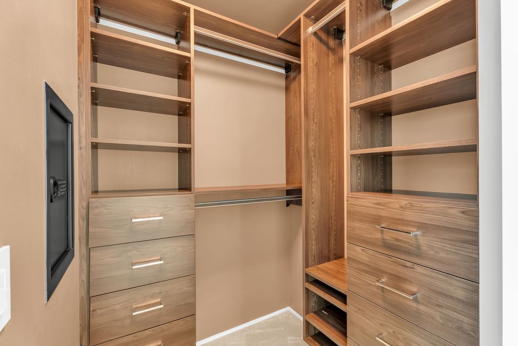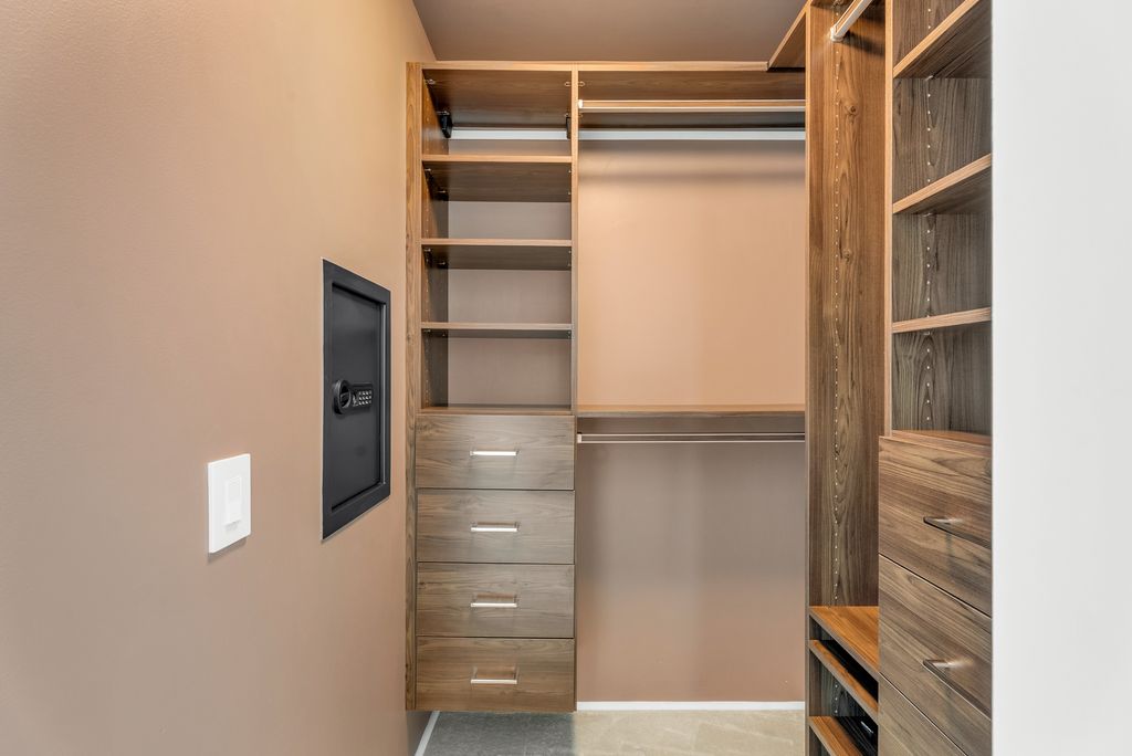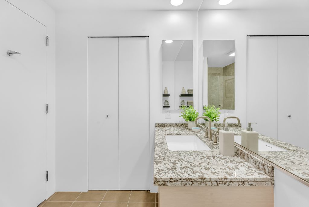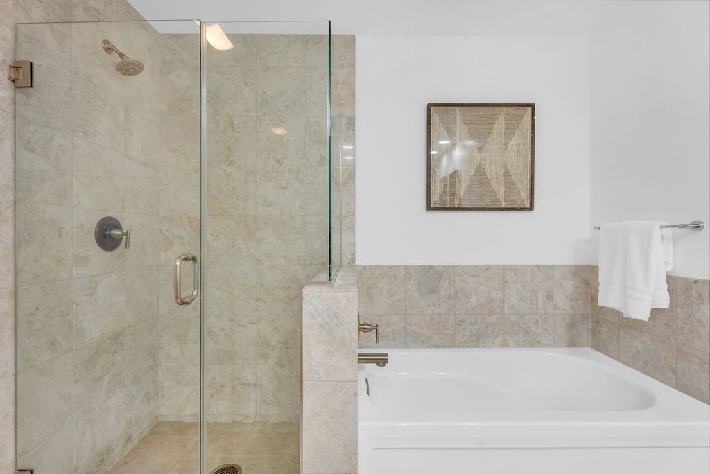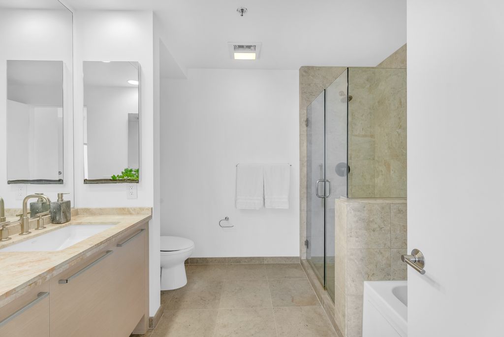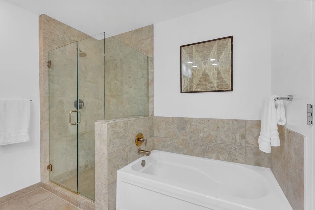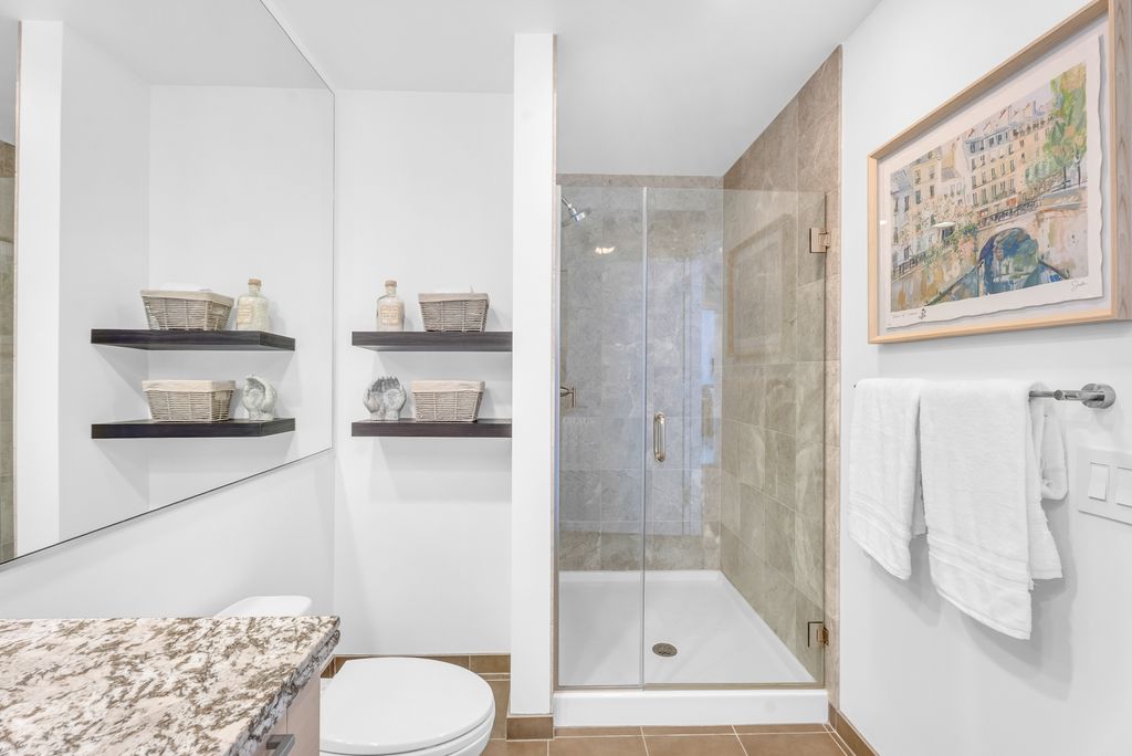 In the expansive living area, floor-to-ceiling windows flood the space with natural light and frame stunning bridge and water views, enhanced by custom window treatments. The primary suite is a luxurious escape with a walk-in closet and spa-inspired ensuite bathroom featuring a double sink, separate shower, and soaking tub.